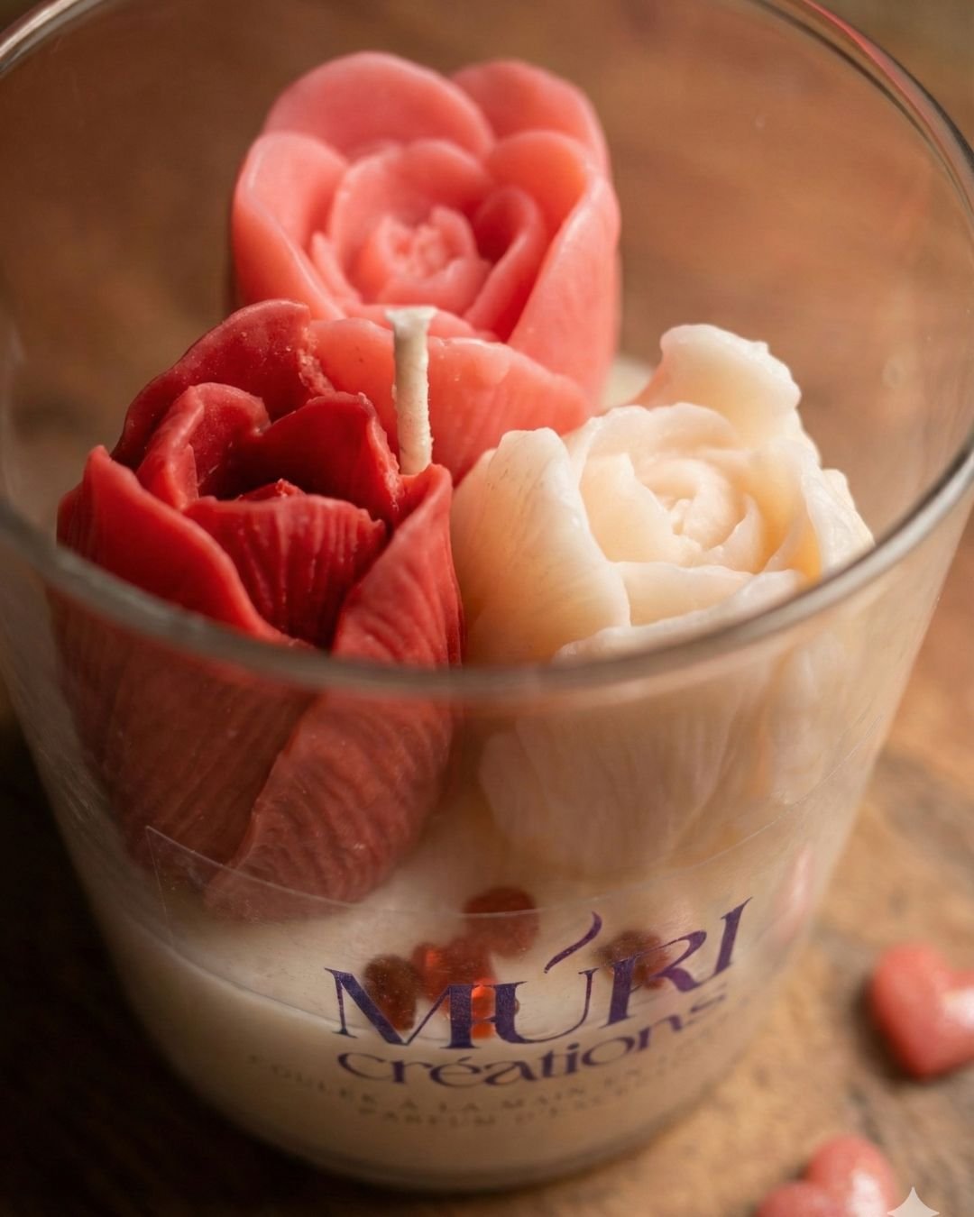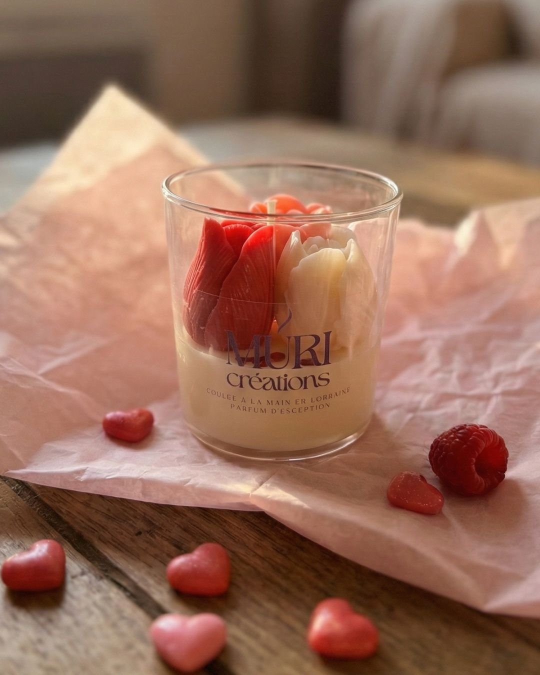 Déclarez votre flamme avec cette magnifique bougie artisanale surmontée d’un trio de tulipes en cire. Un parfum envoûtant mêlant fraîcheur et notes boisées. Fait main en Lorraine.