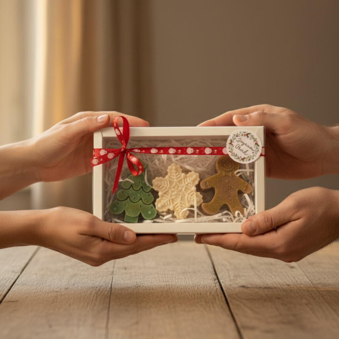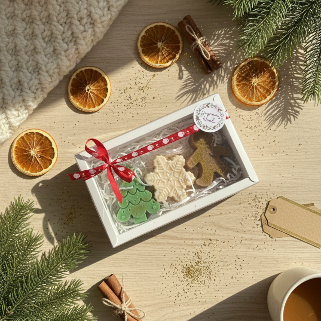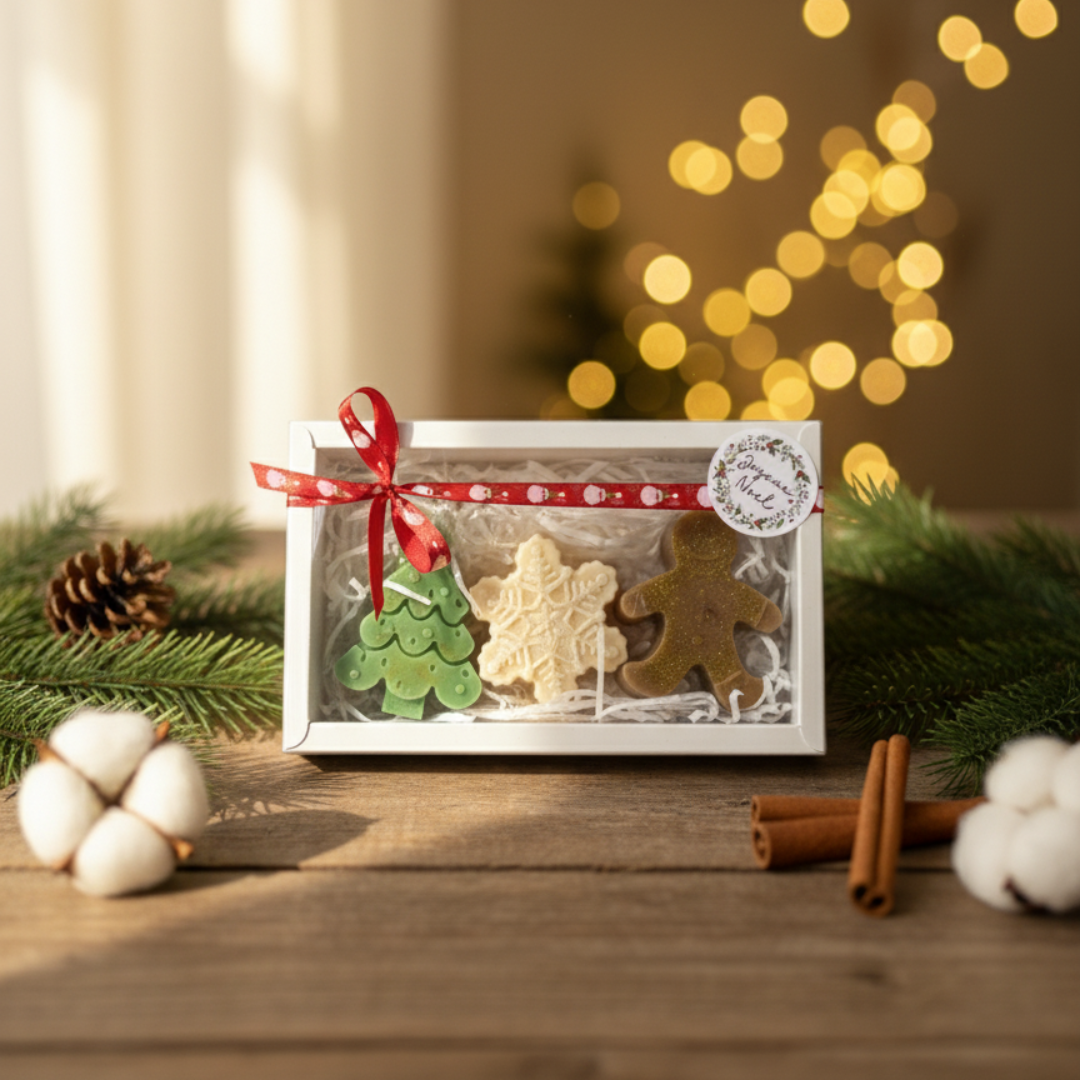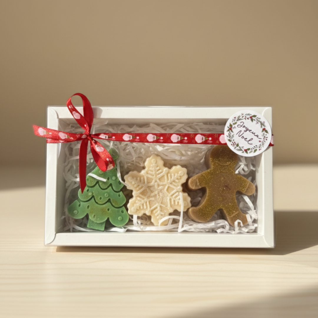 Un coffret de Noël composé de trois mini bougies artisanales — Pain d’Épice, Sapin et Flocon — pour offrir ou s’offrir un moment chaleureux, gourmand et féerique. 🎄✨