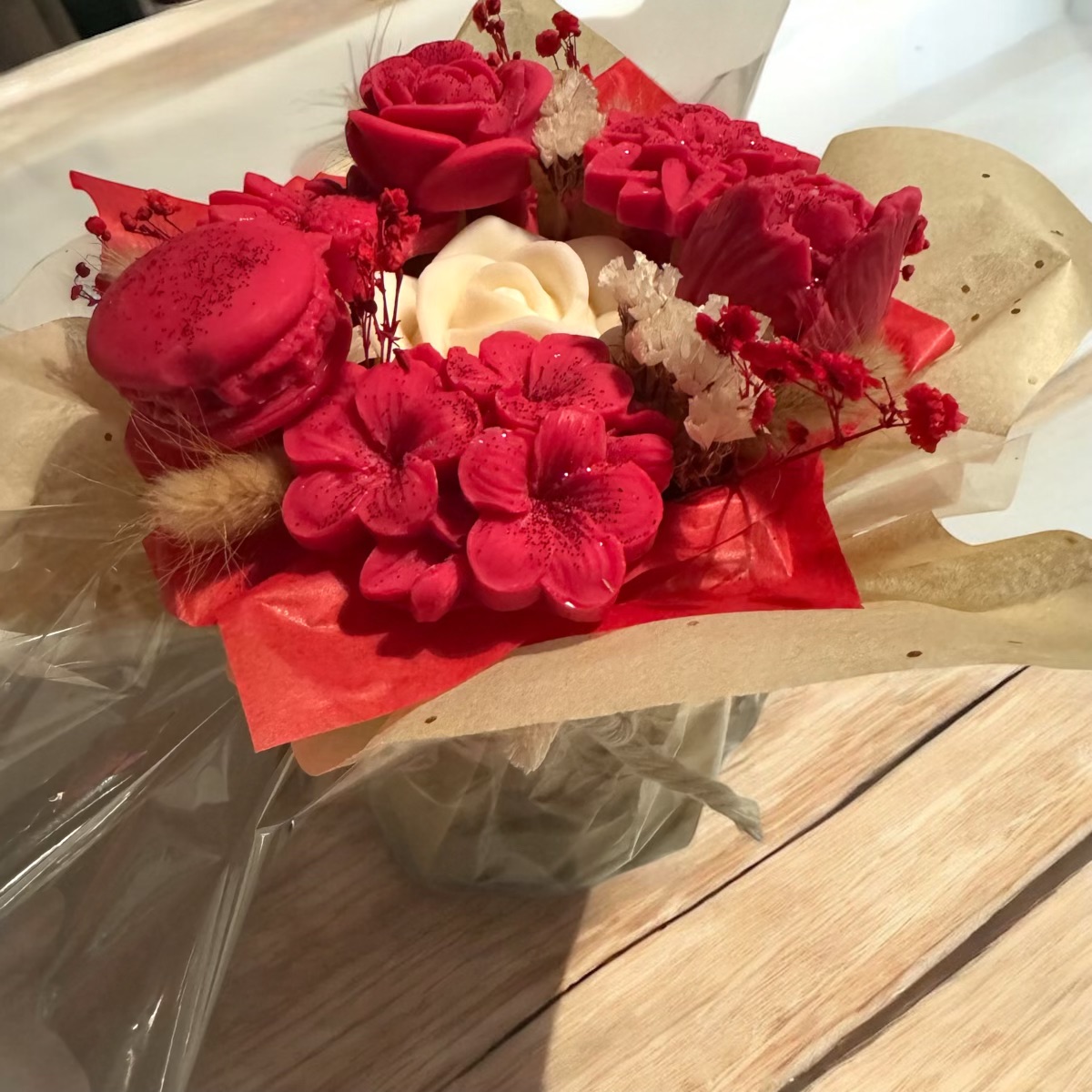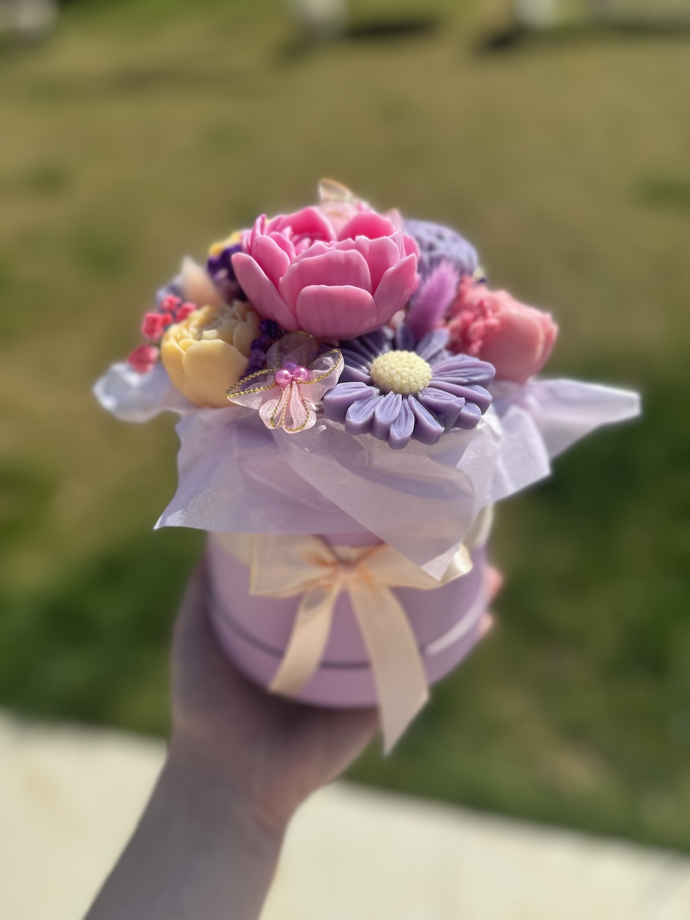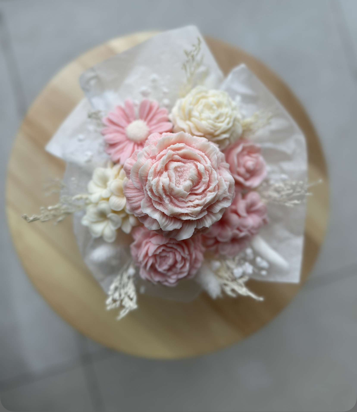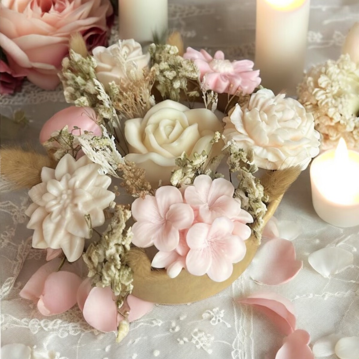 Chaque composition marie des fleurs séchées soigneusement sélectionnées à des fondants parfumés, moulés à la main sous forme de roses, pivoines ou fleurs de cerisier.
