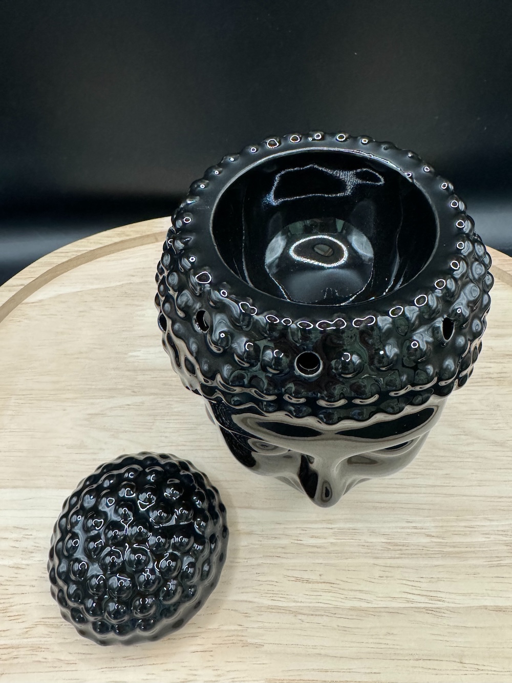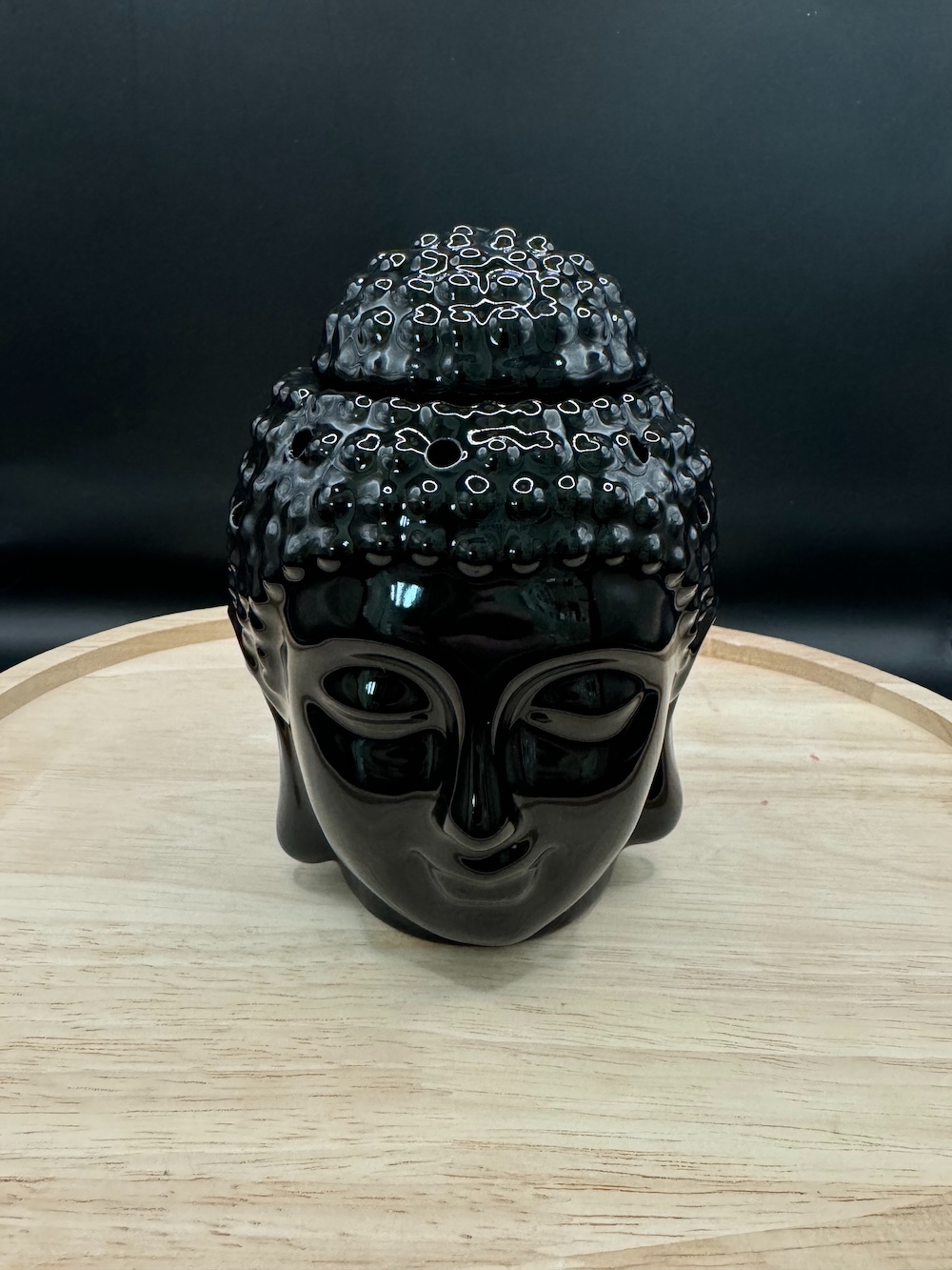 Apportez une touche spirituelle et élégante à votre intérieur avec ce brûleur en forme de tête de Bouddha, entièrement noir et sculpté en céramique.
